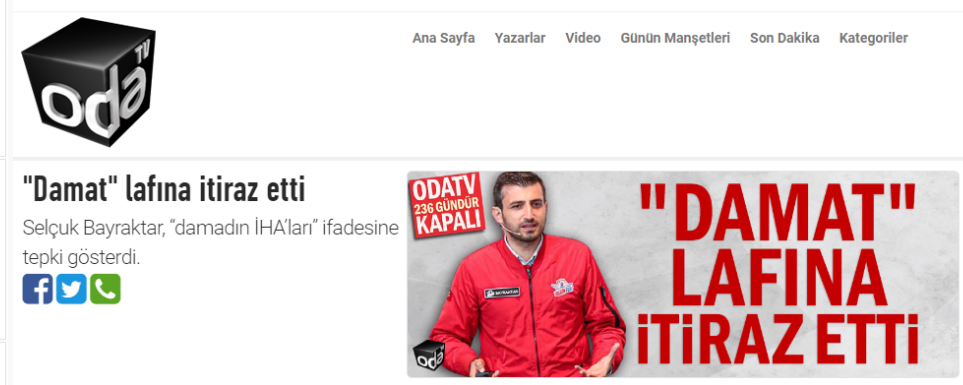 Kelimenin tam anlamıyla TELE 1'i şamarlayan Bayraktar haberi alıntılayarak; “Damadın İHA’ları değil, Milletin S/İHA’ları... Siz isteseniz de uçacak, istemeseniz de!” ifadelerini kullandı.