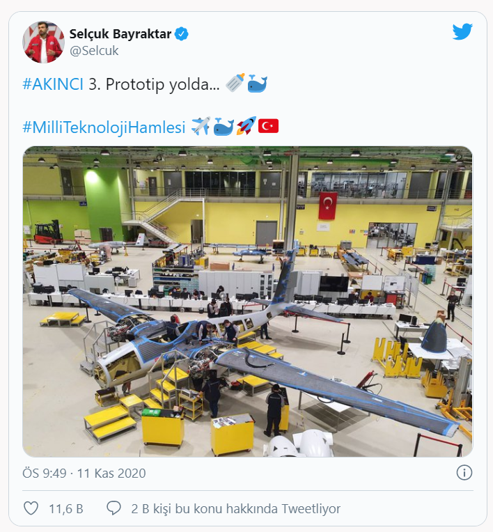 Baykar Teknik Müdürü Selçuk Bayraktar, Twitter hesabı üzerinden yaptığı paylaşımda AKINCI'nın 3. Prototibinin yolda olduğunu duyurdu.