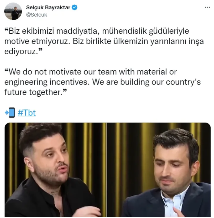 Selçuk Bayraktar, Candaş Tolga Işık'ın "Babanız Özdemir Bey olmasaydı, Baykar sizin olmasaydı. Bu hikaye böyle olmasaydı siz Türkiye'ye geri döner miydiniz?" şeklindeki sorusuna "Bizim kendi ülkemiz için bunları geliştirmemiz kadar ulvi bir şey yok. Yani maddiyat olabilir. Evet. Kendinizi mühendis olarak da en iyi şekilde motive edebilirsiniz ama işin bir de manevi tarafı var. Ülkeye olan borcumuz yok mu? Ülkemize olan vazifemiz yok mu? Evvela böyle bir çalışma yapacaksam elbette kendi ülkem için yapacağım. Ülkemin üstüne üstlük bu kadar başı dertteyken" yanıtını verdi.