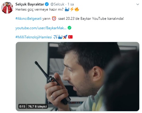 T3 Vakfı Mütevelli Heyeti Başkanı ve Baykar Teknik Müdürü Selçuk Bayraktar sosyal medya hesabından heyecanlandıran bir paylaşımda bulundu. Selçuk Bayraktar, AKINCI TİHA belgeselinin için tarih verdi. Bayraktar, yaptığı paylaşımda, "Herkes güç vermeye hazır mı? #AkıncıBelgeseli yarın saat 20.23'de Baykar YouTube kanalında!" ifadelerini kullandı.