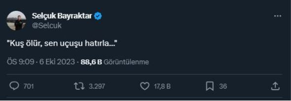 Selçuk Bayraktar, sosyal medya hesabı X'ten yaptığı paylaşımda, İran sanatının en bilinen sanatçılarının başında Furuh Ferruhzad'ın şiirinden alıntı yaparak "Kuş ölür, sen uçuşu hatırla..." ifadelerini kullandı.