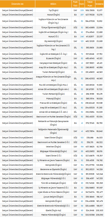 Üniversite taban puanları ve kontenjan sayısı öğrenciler tarafından yoğun ilgi görüyor. Hedefledikleri üniversiteye girebilmek için yoğun şekilde sınava hazırlanan öğrenciler internette üniversitelerin taban puanlarını ve kontenjan sayılarını araştırıyor. Peki, Selçuk Üniversitesi taban puanı, en düşük yüzdelik, en yüksek yüzdelik ve kontenjan sayıları kaçtır?