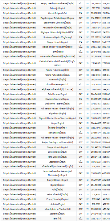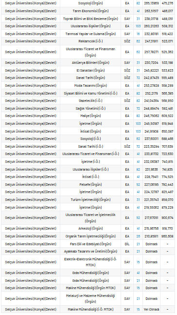 Selçuk Üniversitesi 4 yıllık taban puanları 2021 yüzdelik dilimleri ve kontenjan sayıları kaçtır?