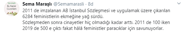 Maraşlı, "2011 de imzalanan AB İstanbul Sözleşmesi ve uygulamak üzere çıkarılan 6284 feministlerin ekmeğine yağ sürdü. Sözleşmeden sonra cinayetler hiç olmadığı kadar arttı. 2011 de 100 iken 2019 de 500 e çıktı fakat hâlâ feministler paracıklar için savunuyorlar." dedi.