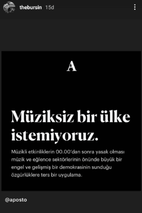 1 Temmuz itibarıyla, koronavirüsle mücadele önlemlerinde normale dönüş başlıyor. Bu kapsamda sokak kısıtlamaları sona erecek ancak canlı müzikle ilgili sınırlama 24.00'e çekilecek. Müziğin tamamen yasaklandığı algısını yapan kokuşmuş mahallenin temsilcisi Kerem Bursin de sosyal medyadan skandal paylaşım yaptı.
