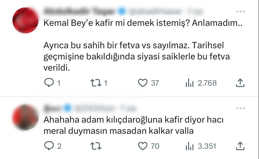 Davutoğlu'nun bu sözleri sosyal medyada tartışılırken, bir sosyal medya kullanıcısı, "Kemal Bey'e kafir mi demek istemiş? Anlamadım... Ayrıca bu sahih bir fetva vs sayılmaz. Tarihsel geçmişine bakıldığında siyasi saiklerle bu fetva verildi" derken bir başka sosyal medya kullanıcısı ise "Adam Kılıçdaroğlu'na kafir diyor hacı Meral duymasın masadan kalkar valla" diyerek Davutoğlu'nu ti'ye aldı.