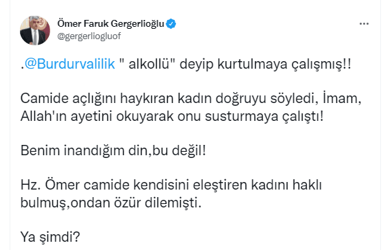 HDP Kocaeli Milletvekili Ömer Faruk Gergerlioğlu, "Burdur Valiliği, 'alkollü' deyip kurtulmaya çalışmış!! Camide açlığını haykıran kadın doğruyu söyledi, İmam, Allah'ın ayetini okuyarak onu susturmaya çalıştı! Benim inandığım din, bu değil! Hz. Ömer camide kendisini eleştiren kadını haklı bulmuş,ondan özür dilemişti. Ya şimdi?
