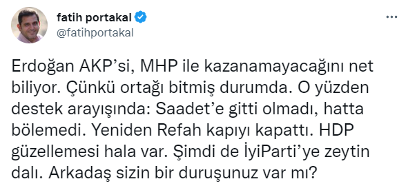 Erdoğan AKP’si, MHP ile kazanamayacağını net biliyor. Çünkü ortağı bitmiş durumda. O yüzden destek arayışında: Saadet’e gitti olmadı, hatta bölemedi. Yeniden Refah kapıyı kapattı. HDP güzellemesi hala var. Şimdi de İyi Parti’ye zeytin dalı. Arkadaş sizin bir duruşunuz var mı?