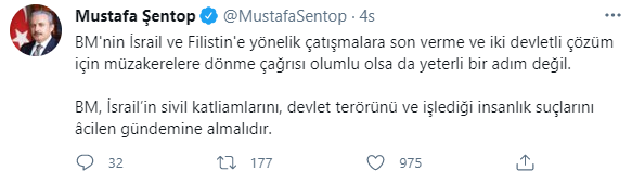 TBMM Başkanı Mustafa Şentop, Twitter'dan yaptığı paylaşımda, "BM'nin İsrail ve Filistin'e yönelik çatışmalara son verme ve iki devletli çözüm için müzakerelere dönme çağrısı, olumlu olsa da yeterli bir adım değil. BM, İsrail'in sivil katliamlarını, devlet terörünü ve işlediği insanlık suçlarını acilen gündemine almalıdır." değerlendirmesini yaptı.