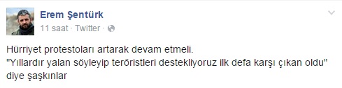 Yapılan protestolara değinen Gazeteci Yazar Erem Şentürk, sosyal medya hesabından yaptığı açıklamada, Hürriyet'e yapılan eylemlerin artarak devam etmesi gerektiğini kaydetti. Şentürk, "Hürriyet protestoları artarak devam etmeli. 'Yıllardır yalan söyleyip teröristleri destekliyoruz ilk defa karşı çıkan oldu' diye şaşkınlar" ifadelerini kullandı.