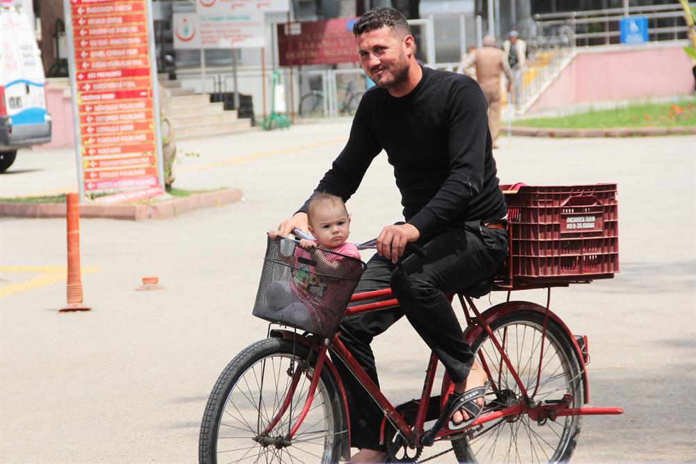 Babasının bisikletinde sepete oturan Nida etraftakilerin dikkati çekti.