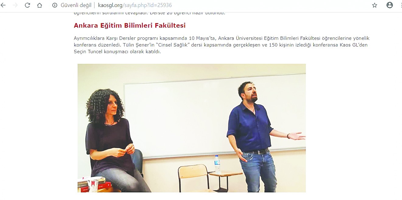 Ahlaksız faaliyetler Ankara Üniversitesi Eğitim Fakültesi’ne de taşınmış. Ankara Üniversitesi’nden Tülin Şener’in, “Cinsel sağlık” dersine katılan KAOS GL’den Seçin Tuncel 150 öğrenciye konferans vermiş. Türkiye’nin en mümtaz eğitim kurumlarını kendilerine yol yapan KAOS GL, TED Üniversitesi Eğitim Fakültesi’nde de ders vermiş. TED Üniversitesi’nden Gamze Göker’in “Alternatif Medya” dersine katılan Seçin Tuncel, eşcinsel sapkınlık propagandası yapmış.