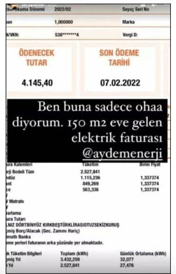 Evine 4 bin 100 TL elektrik faturası gelen ve halen Bodrum'da yaşayan sunucu Seray Sever Instagram hesabından faturaya ait fotoğrafı paylaşarak, "Ben buna sadece oha diyorum. 150 metrekare eve gelen fatura" dedi.