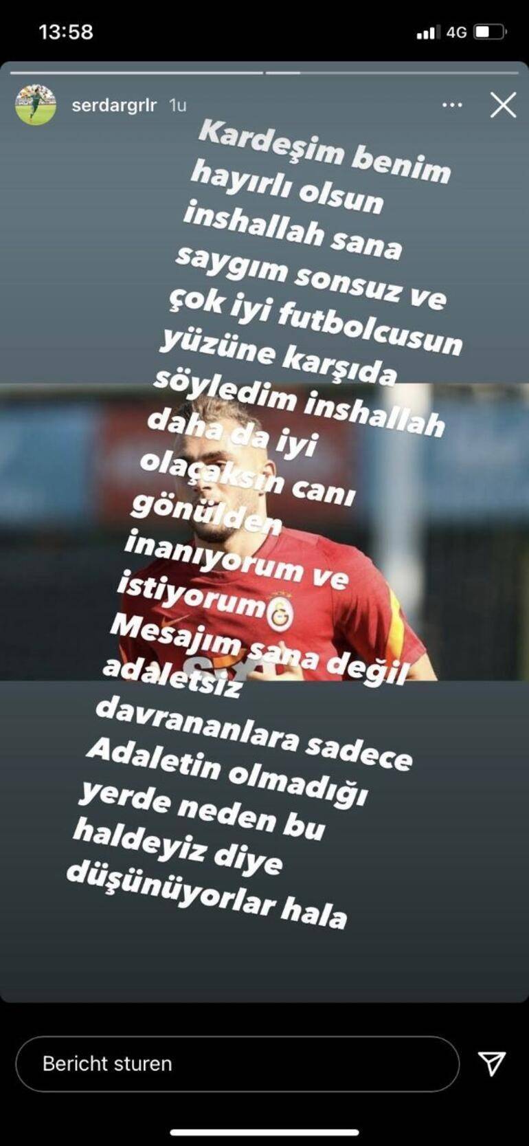 Kişisel Instagram hesabından bir paylaşım yapan Serdar Gürler, "Kardeşim benim, hayırlı olsun inşallah. Sana saygım sonsuz ve çok iyi futbolcusun. Yüzüne karşı da söyledim. İnşallah daha da iyi olacaksın canı gönülden inanıyorum ve istiyorum. Mesajım sana değil, adaletsiz davrananlara. Adaletin olmadığı yerde, neden bu haldeyiz diye düşünüyorlar hala." ifadelerini kullandı.