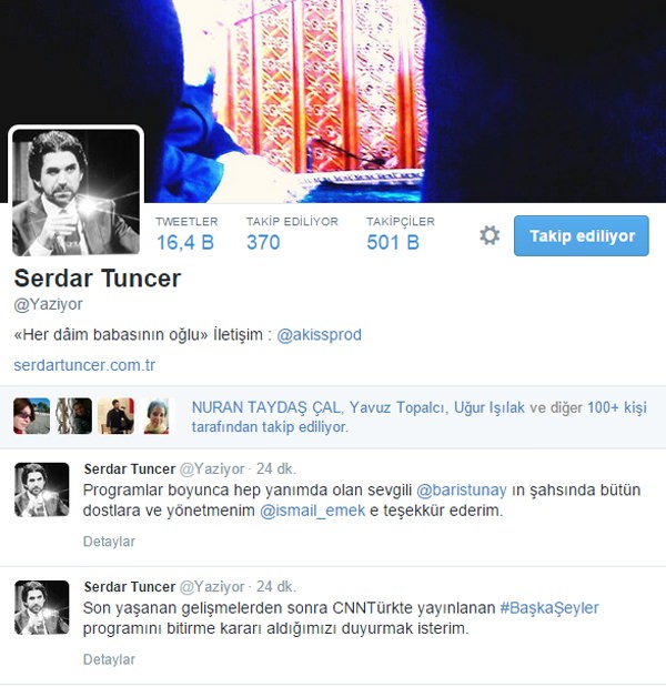 CNN Türk'te program yapan Serdar Tuncer, son yaşanan gelişmeler sonrası CNN Türk'te yayınlanan Başka Şeyler programını bitirme kararı aldı.