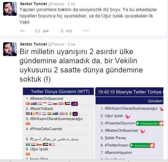 Tuncer Twitter hesabından, "Bir milletin uyanışını 2 asırdır ülke gündemine alamadık da, bir Vekilin uykusunu 2 saatte dünya gündemine soktuk(!)" mesajını paylaştı.