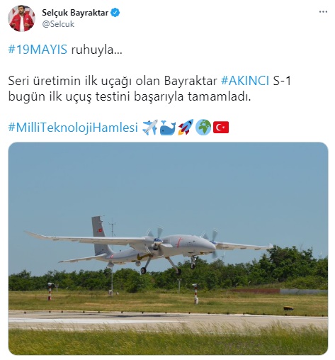 Konuyla ilgili olarak Selçuk Bayraktar tarafından yapılan açıklamada, "19MAYIS ruhuyla… Seri üretimin ilk uçağı olan Bayraktar AKINCI S-1 bugün ilk uçuş testini başarıyla tamamladı." ifadelerine yer verildi.