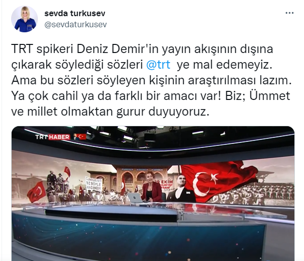 TRT Haber Spikeri Deniz Demir'in ümmeti hedef alan konuşmasını eleştiren gazeteci Sevda Türküsev, "Biz ümmet ve millet olmaktan gurur duyuyoruz." dedi ve Demir'in sözlerinin TRT'ye mal edilemeyeceğini söyledi.