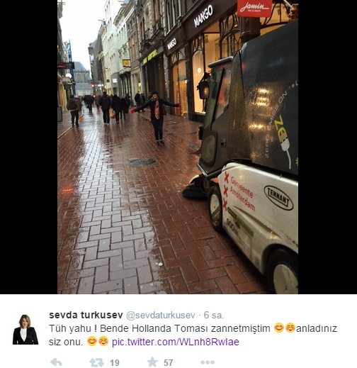 YENİAKİT.COM.TR - Gazeteci-Yazar Sevda Türküsev bugün Hollanda'da bir temizlik aracının önüne geçip meydan okudu. Temizlik aracı için "Tüh yahu ben de Hollanda Toma'sı zannetmiştim" diyen Türküsev, Gezi Olayları'nda simge olmaya çalışırken temizlik aracını Toma sanıp önüne geçen eylemcinin nezdinde, Gezi zihniyetine göndermede bulundu.
