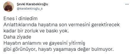 Tarihçi Yazar Şevki Karabekiroğlu, Türkiye'nin gündemine yerleşen tıp öğrencisi Enes Kara intiharıyla ilgili, “Hayatın anlamını ve gayesini yitirmiş gibi görünüyor, hayatı yaşamaya değer bulmuyor.” şeklinde dikkat çeken bir paylaşımda bulundu.
