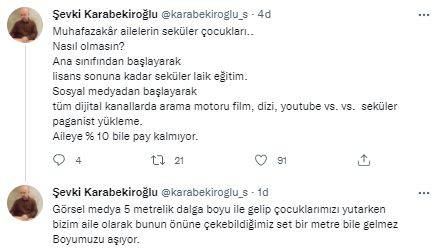 Öte yandan Karabekiroğlu, Twitter hesabından yaptığı bir diğer paylaşımda, 'muhafazakar ailelerin seküler çocukları...' şeklinde çarpıcı bir başlık ile dikkat çeken ifadelerde bulundu.