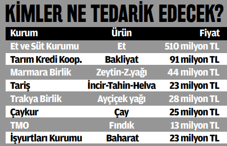 Milli Savunma Bakanlığı ile Gıda, Tarım ve Hayvancılık Bakanlığı Mehmetçiğin sağlıklı beslenmesi için seferber oldu. Türk Silahlı Kuvvetleri’nde görev yapan er, erbaş ve subayların yemeğinde kullanılan malzemeleri karşılayan markaların belli olmasının ardından gıda üretimi yapan firmalar, kışlalardaki askerlerin yanısıra Zeytin Dalı harekâtı kapsamında Afrine doğru ilerleyen Mehmetçik için de üretimlerine hız verdi. Bu yıl içinde toplam 758 milyon liralık malzeme alımı yapacak olan bakanlıklar Tarım Kredi Kooperatifleri başta olmak üzere çoğu resmi kurumlardan sürekli koordinasyon halinde. 510 milyon lira ile en büyük alımın planlandığı Et ve Süt Kurumu da söz konusu seferberlikte büyük rol oynuyor.