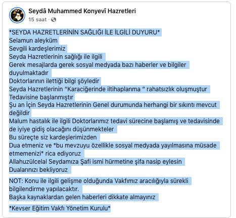 Seyda Muhammed Konyevi Hazretlerinin sağlığı ile ilgili gerek mesajlarda gerek sosyal medyada bazı haberler ve bilgiler duyulmaktadır. Kevser Eğitim Vakfı Yönetim Kurulu da Seyda Muhammed Konyevi sağlık durumuna ilişkin sosyal medya üzerinden bir açıklama yaptı. Peki Seyda Muhammed Konyevi hastalandı mı? Seyda Muhammed Konyevi sağlık durumu nasıl?