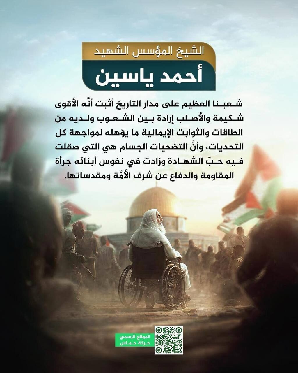 "Filistinli direnişin önderi, Hamas hareketinin kurucusu Şeyh Ahmed Yasin’in şehadetinin 22. yıl dönümü: