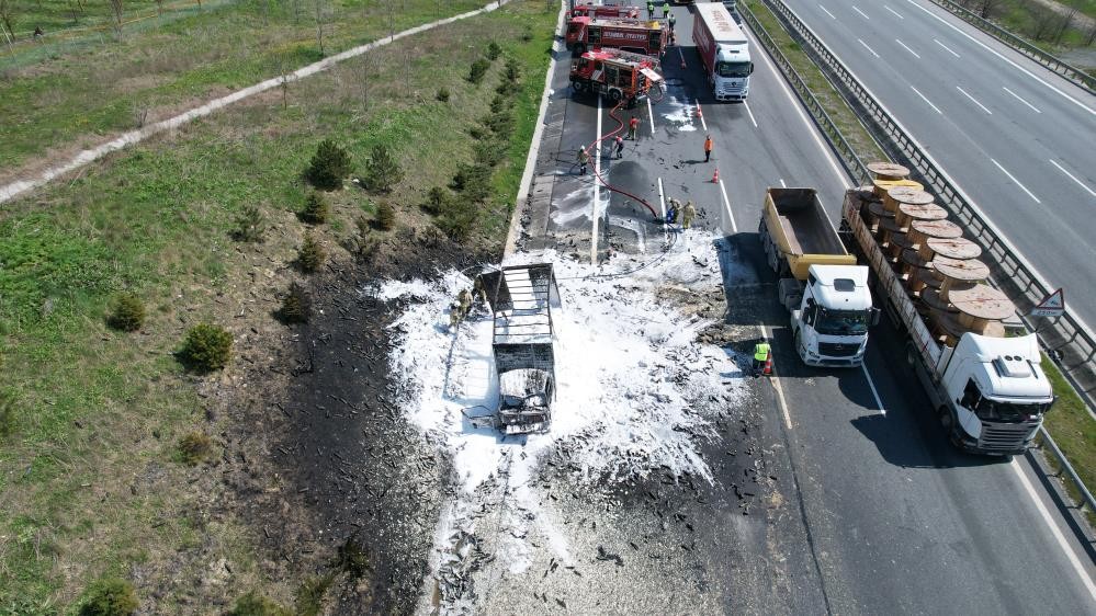 Kuzey Marmara Otoyolu'nda seyir halindeki köpük sprey yüklü kamyon, henüz bilinmeyen bir nedenle alev aldı.