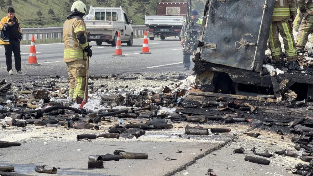 Kamyon kasasında bulunan spreylerin patlamasıyla otoyolda panik yaşanırken, yolun iki şeridi trafiğe kapandı.
