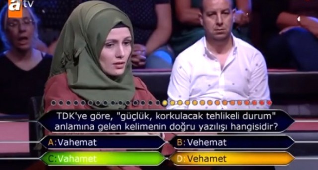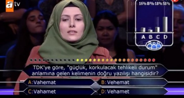 Yarışmacıya sorulan soru şu şekildeydi; TDK`ye göre `Güçlük, korkulacak, tehlikeli durum` anlamına gelen kelimenin doğru yazılımı nedir? Şıklar arasında kararsız kalan yarışmacı seyirci joker hakkını kullanmak istedi.