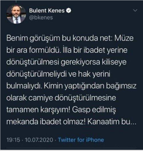 FETÖ soruşturmasının firari sanığı Today's Zaman gazetesinin eski Genel Yayın Yönetmeni Bülent Keneş, sosyal medya hesabından skandal bir paylaşımda bulunarak "Ayasofya kiliseye dönüştürülmeliydi" dedi.
