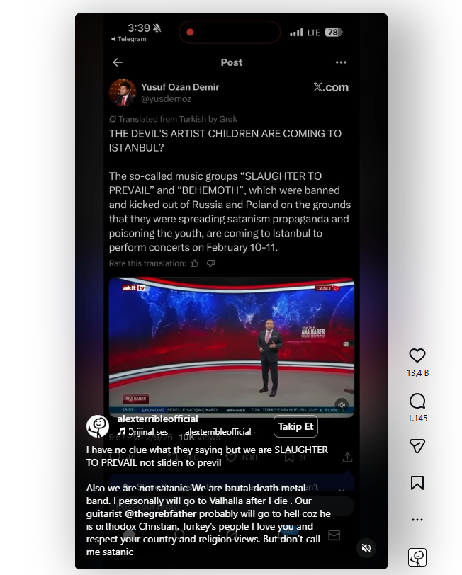 "Slaughter Top Prevail" isimli sapkın grubun satanist solisti Alex Terrible, sosyal medya hesabı üzerine Akit'i hedef gösterdi.