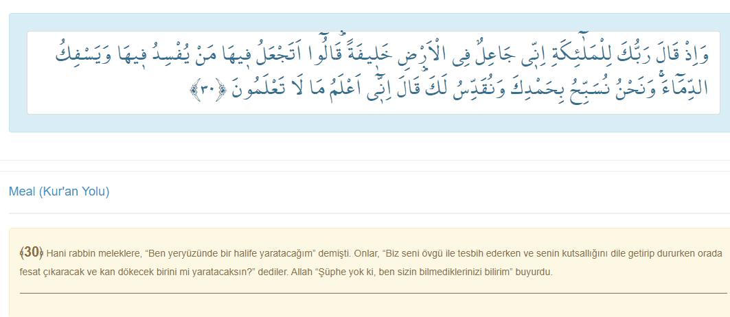 Cenab-ı Allah, "Hani rabbin meleklere, 'Ben yeryüzünde bir halife yaratacağım^' demişti. Onlar, 'Biz seni övgü ile tesbih ederken ve senin kutsallığını dile getirip dururken orada fesat çıkaracak ve kan dökecek birini mi yaratacaksın?' dediler. Allah 'Şüphe yok ki, ben sizin bilmediklerinizi bilirim' buyurdu.