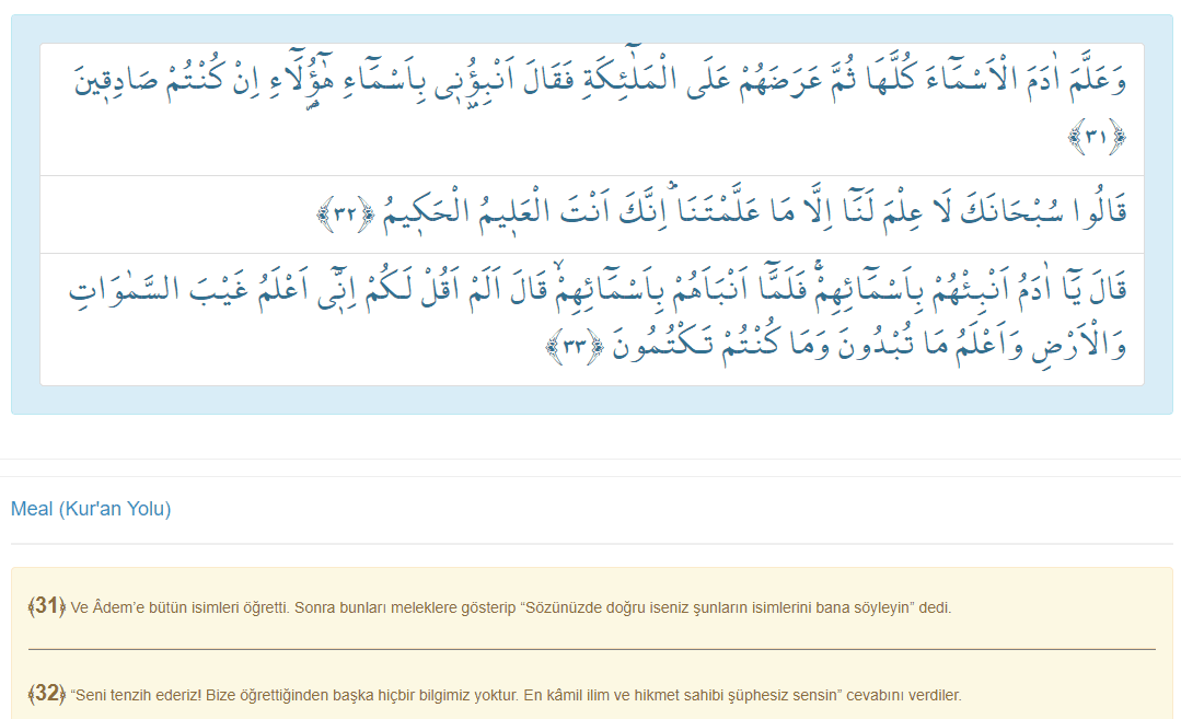 Bakara Suresi'nin 30, 31, 32 ve 33. ayetleri şöyle: