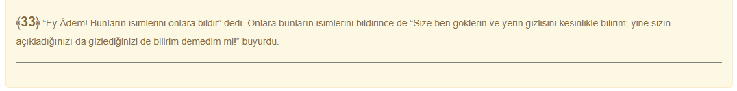 'Ey Âdem! Bunların isimlerini onlara bildir' dedi. Onlara bunların isimlerini bildirince de 'Size ben göklerin ve yerin gizlisini kesinlikle bilirim; yine sizin açıkladığınızı da gizlediğinizi de bilirim demedim mi!' buyurdu.