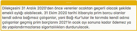 Prim tutarının tebliğ edilmesinin ardından tamamı marta kadar ödenirse sigortalılık aktif hale gelecek. Prim ödemeleri asgari ücret üzerinden yapılıyor. Vefat eden Bağ- Kur'luların yakınları da dul ve yetim aylığı için primleri canlandırmak için başvurabilecek. Bağ-Kur'lu olup da çalışmaya devam edenlerin emekli olabilmesi için 1 Kasım 2020 ile emekli olacakları tarih arasındaki günlerin primlerini yatırması gerekiyor.