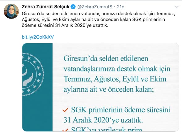 SGK prim ödemeleri ne zaman? Aile, Çalışma ve Sosyal Hizmetler Bakanı Zehra Zümrüt Selçuk, Giresun’da etkili olan sağanak yağış sonrası oluşan sel nedeniyle SGK prim ödemelerine ilişkin açıklama yaptı. Bakan Zehra Zümrüt Selçuk Giresun’da geçtiğimiz gün meyana gelen sel felaketi sonrası SGK prim ödeme süresi 31 Aralık'a, SGK’ya verilecek prim belgelerinin süresi 15 Aralık’a ertelendiğini duyurdu.