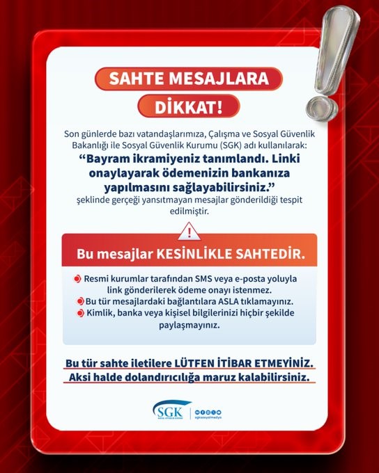 "Sahte mesajlara dikkat. Son günlerde bazı vatandaşlarımıza, Çalışma ve Sosyal Güvenlik Bakanlığı ile SGK adı kullanılarak, ‘Bayram ikramiyeniz tanımlandı. Linki onaylayarak ödemenizin bankanıza yapılmasını sağlayabilirsiniz’ şeklinde gerçeği yansıtmayan mesajlar gönderildiği tespit edilmiştir. Bu mesajlar kesinlikle sahtedir. Resmi kurumlar tarafından SMS veya e-posta yoluyla link gönderilerek ödeme onayı istenmez. Bu tür mesajlardaki bağlantılara asla tıklamayınız. Kimlik, banka veya kişisel bilgilerinizi hiçbir şekilde paylaşmayınız. Bu tür sahte iletilere lütfen itibar etmeyiniz. Aksi halde dolandırıcılığa maruz kalabilirsiniz. Şüpheli durumlarda: Alo 170 Çalışma Hayatı İletişim Merkezi’ni arayabilirsiniz. CİMER üzerinden başvuru yapabilirsiniz. SGK il müdürlükleri/merkezlerine şahsen başvurabilirsiniz.”