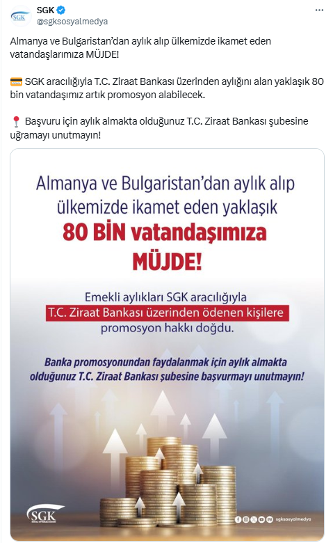 "Almanya ve Bulgaristan'dan aylık alıp ülkemizde ikamet eden vatandaşlarımıza müjde. SGK aracılığıyla T.C. Ziraat Bankası üzerinden aylığını alan yaklaşık 80 bin vatandaşımız artık promosyon alabilecek. Başvuru için aylık almakta olduğunuz T.C. Ziraat Bankası şubesine uğramayı unutmayın."
