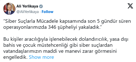 Emniyet güçlerinin siber suçlarla mücadelesi hız kesmeden devam ederken, İçişleri Bakanımız Sayın Ali Yerlikaya, Siber Suçlarla mücadele kapsamında son 5 gündür yürütülen operasyonlarda 346 şüphelinin yakalandığını açıkladı.