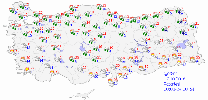 Yapılan son değerlendirmelere göre, Marmara, İç Ege, Batı Akdeniz'in iç kesimleri, İç Anadolu, Karadeniz ve Doğu Anadolu'nun kuzeyi ile Malatya çevrelerinin yağışlı geçeceği tahmin ediliyor. Genellikle yağmur ve sağanak, akşam saatlerinden sonra Doğu Karadeniz'in iç kesimleri ile Doğu Anadolu'nun kuzeydoğusunda karla karışık yağmur ve yükseklerinde yer yer kar şeklinde olması beklenen yağışların; Doğu Karadeniz kıyı kesiminde kuvvetli (21-50 mm), Rize çevreleri ile Trabzon'un doğu ve Artvin'in kıyı ilçelerinde yer yer çok kuvvetli (51-75 mm) olması bekleniyor.
