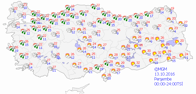 Yapılan son değerlendirmelere göre; Marmara'nın doğusu, Kuzey ve Kıyı Ege, Batı ve Orta Karadeniz, Doğu Karadeniz'in kıyı kesimleri, Uşak çevreleri ile Antalya'nın doğu kesimlerinin yerel olmak üzere sağanak yağışlı, diğer yerlerin parçalı ve az bulutlu geçeceği tahmin ediliyor.