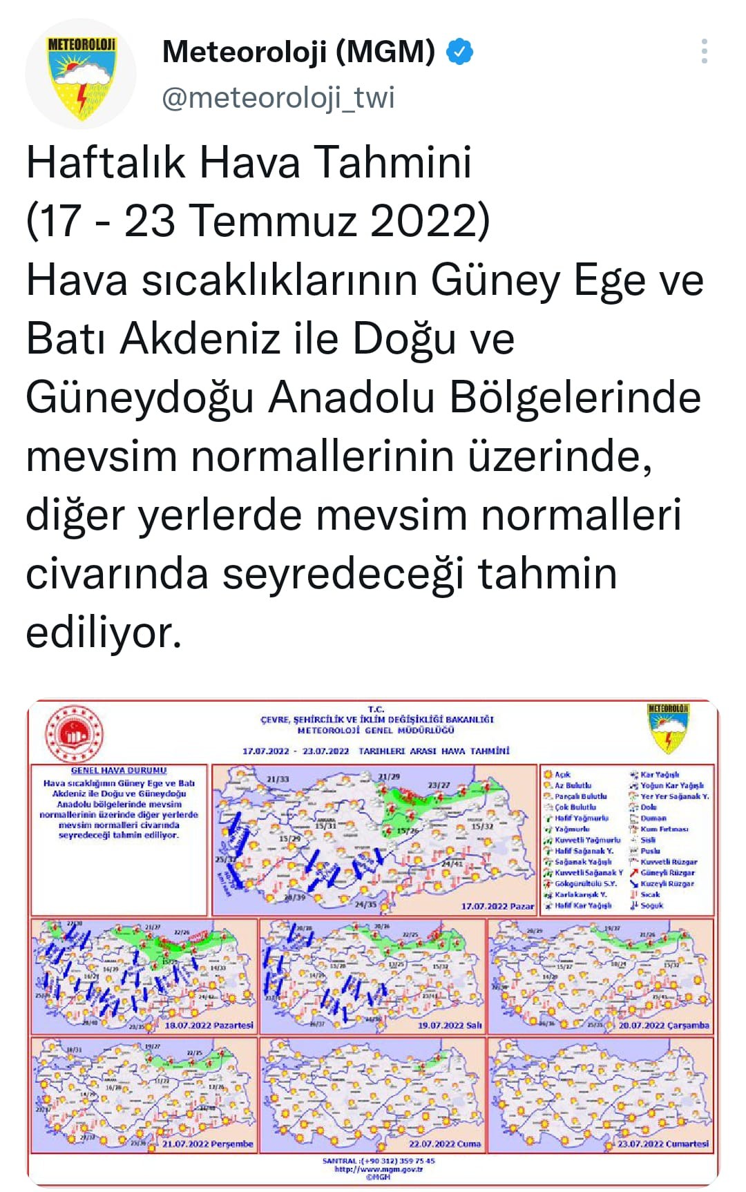 Meteoroloji Genel Müdürlüğü, resmi sosyal medya hesabından yapılan açıklamada, “Haftalık Hava Tahmini (17 - 23 Temmuz 2022)Hava sıcaklıklarının Güney Ege ve Batı Akdeniz ile Doğu ve Güneydoğu Anadolu Bölgelerinde mevsim normallerinin üzerinde, diğer yerlerde mevsim normalleri civarında seyredeceği tahmin ediliyor"denildi.