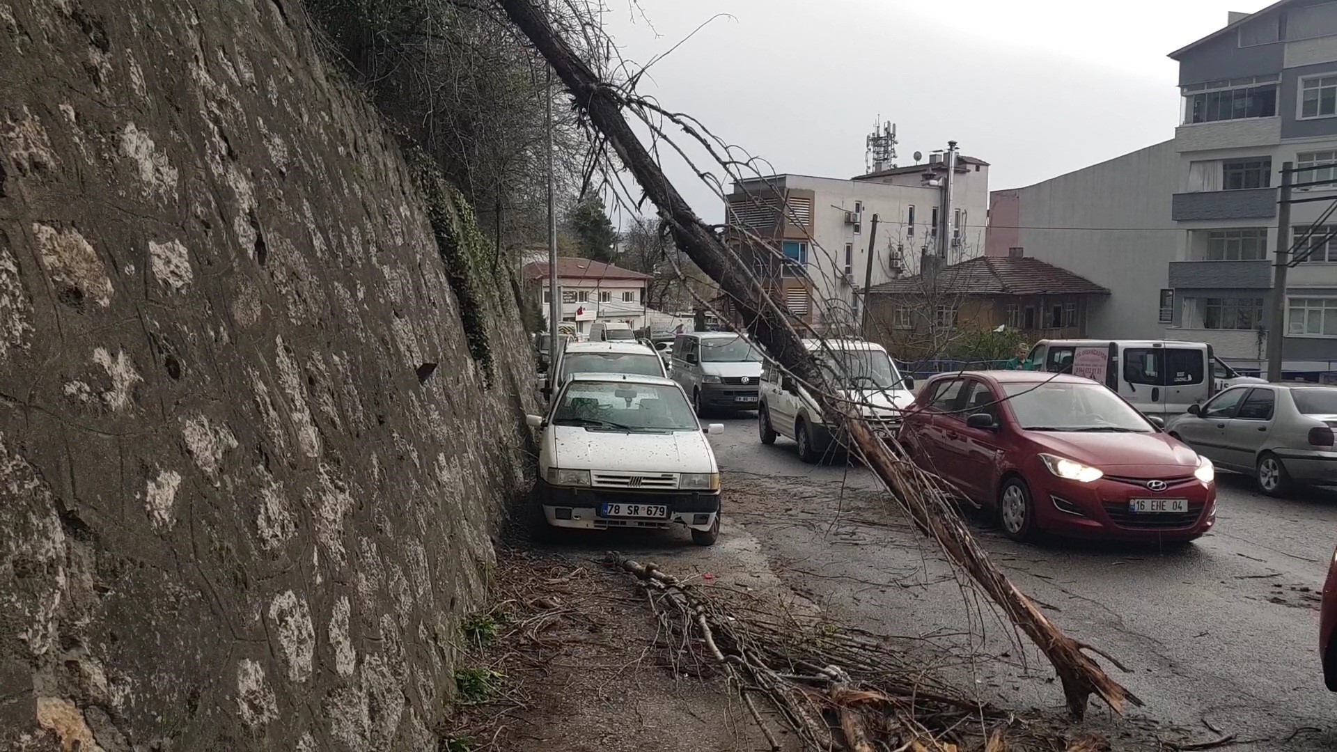 Karabük’te etkili olan rüzgar sonrası devrilen ağaç iki araca zarar verdi.