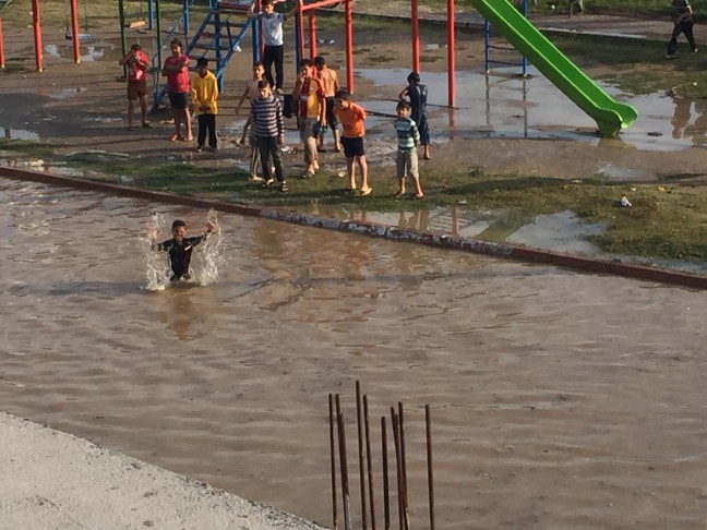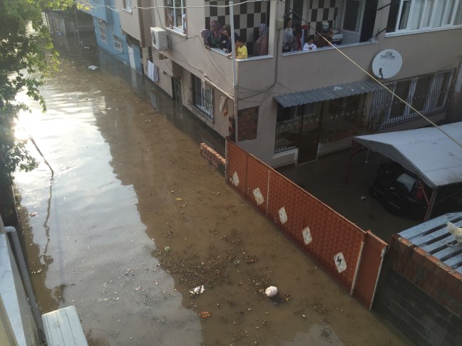 Mahalle sakinleri eşyaları kullanılamaz hale geldiği için kara kara düşünürken yolların göle dönmesine ise sadece çocuklar sevindi. Çocuklar biriken yağmur suyunda yüzerken, bazı araçlar ise mahsur kaldı. Motosiklet ile karpuz satmaya çalışan bir kişi de su birikintisi içinde kaldı.