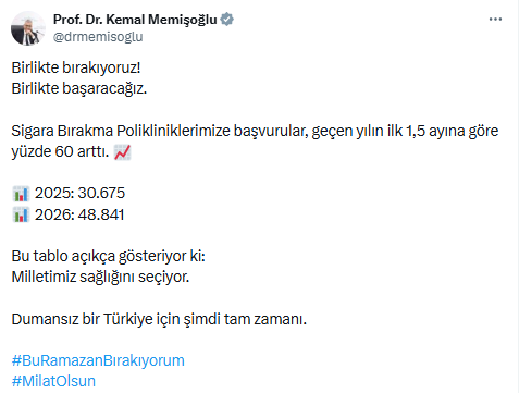 "Birlikte bırakıyoruz. Birlikte başaracağız. Sigara bırakma polikliniklerimize başvurular, geçen yılın ilk 1,5 ayına göre yüzde 60 arttı. 2025'te 30 bin 675, 2026'da 48 bin 841.