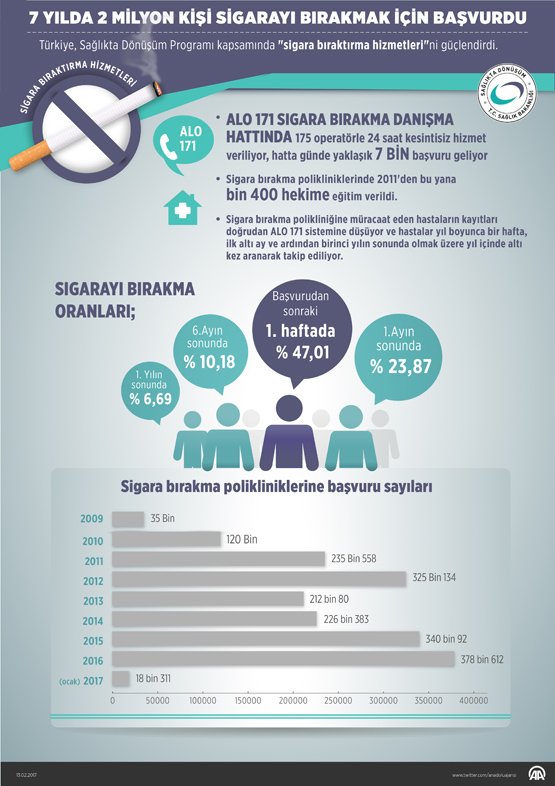 Sigara bırakmak için polikliniklere 2009'da 35 bin, 2010'da 120 bin, 2011'de 235 bin 558, 2012'de 325 bin 134, 2013'te 212 bin 80, 2014'te 226 bin 383, 2015'te 340 bin 92 ve 2016'da 378 bin 612 kişi başvurdu. Bu yılın ilk ayında ise başvuru sayısı 18 bin 311 olarak belirlendi.