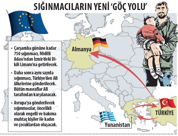 Geçen yıl Kasım ayından bu yana müzakere edilen ve 20 Mart’ta üzerinde anlaşılan çözüm formülü, bugün uygulanmaya başlanıyor. Anlaşmaya göre Türkiye’den Ege Denizi’ndeki Yunan adalarına geçen göçmenler iade edilecek. İlk etapta 72 bin Suriyeli göçmeni kapsayacak anlaşmaya göre, Türkiye’ye geri gönderilen her göçmen karşılığında Türkiye’de bulunan bir Suriyeli AB ülkelerine yerleştirilecek. Avrupa’ya gidecek sığınmacıların ilk adresi olacak Almanya ise ilk aşamada bin 600 kişiyi kabul edeceğini, 13 bin 500 kişi için de hazır olduğunu duyurmuştu.