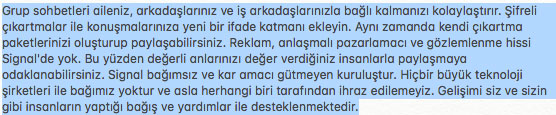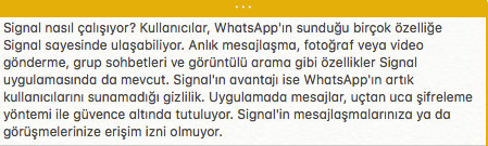 Signal sahip olduğumuz en geliştirilebilir şifreleme aracı. Signal, uçtan uca şifreleme konuşmalarınızı güvende tutar. Signal nedir? Signal nasıl kullanılır? Nereden indirilir? Signal'in özellikleri nelerdir? Signal ve Whatsapp arsındaki farklar nelerdir? WhatsApp gizlilik politikasını yeniledi ve kullanıcı verilerinin Facebook'la paylaşılacağını bildirdi. Güncellenen sözleşmeyi kabul etmeyenler, 8 Şubat'tan sonra WhatsApp'ı kullanamayacak. Whatsapp’ın kullanıcı verilerine erişeceğini duyurmasının ardından, Cumhurbaşkanlığı’ndan kritik bir adım geldi. Cumhurbaşkanlığı İletişim Başkanlığı, 11 Ocak’tan itibaren, gazetecilere yaptığı bilgilendirmeleri Whatsapp yerine BİP üzerinden yapma kararı aldı.